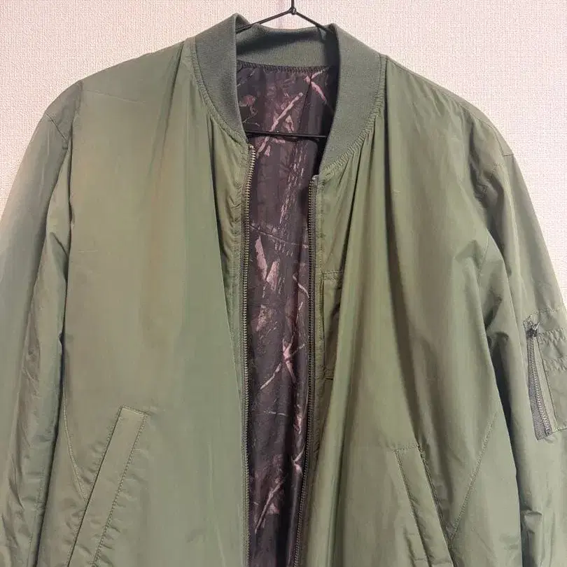 MA-1 스타일 올리브 그린 자켓, 카모 패턴 안쪽과 리브 옷깃이 특징. 리버서블. - 색상: 올리브 그린 - 디자인: MA-1 스타일 - 안쪽 소재: 카모 패턴 - 지퍼: 프론트 지퍼 - 옷깃 디자인: 리브 옷깃 방문해 주셔서 감사합니다. 사이즈 - M 사이즈 - L