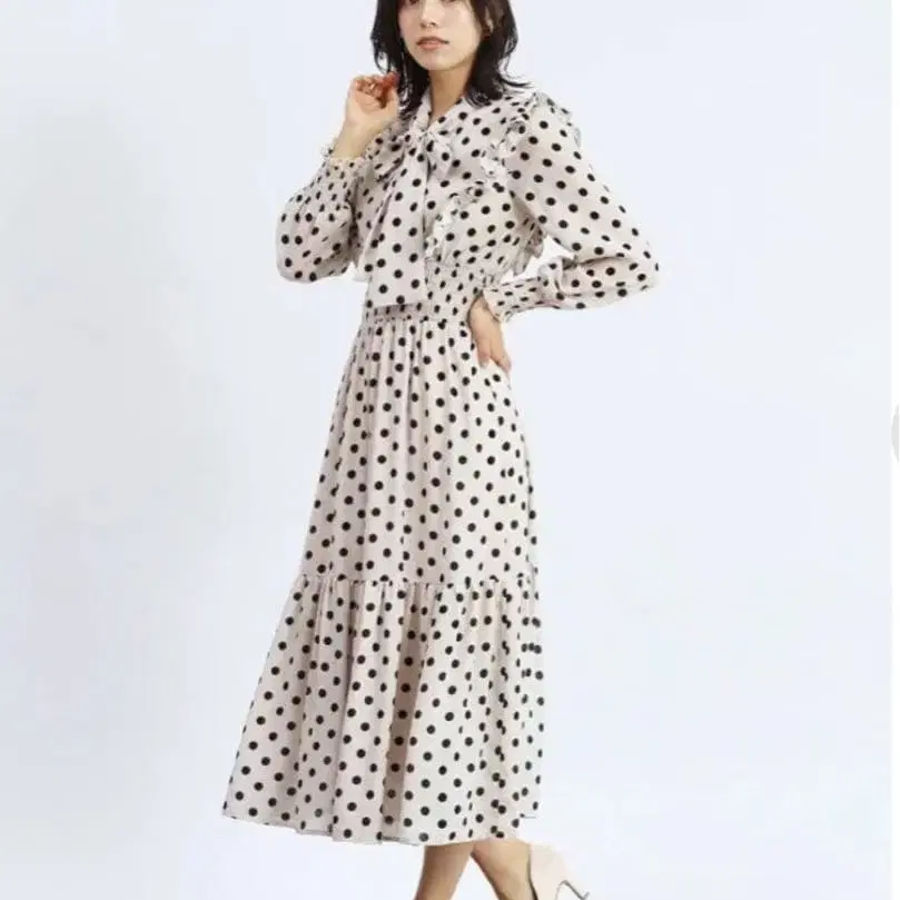 자동 번역되었어요. 원문보기베이지 색상에 블랙 물방울 무늬, 프릴이 달린 맥시 드레스.