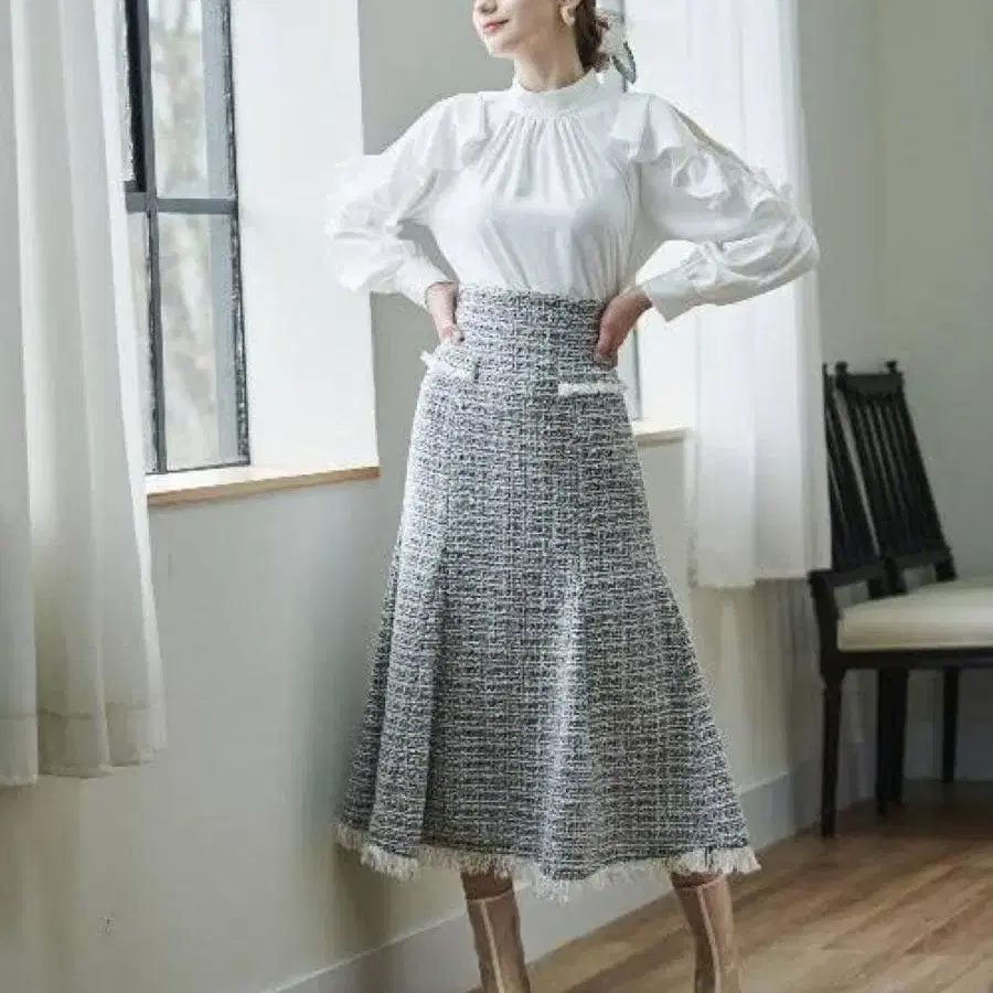 [ 럭셔리한 트위드 원단이 트렌디한 코디네이트를 완성하는 머메이드 스커트 ] [ Design/Styling ] 트렌디한 트위드가 눈길을 끄는, 고급스러운 머메이드 스커트. 프론트는 깔끔하게 포켓만 디자인되었고, 백 스타일은 레이스업으로 원하는 허리 사이즈에 조정할 수 있는 사양입니다. 머메이드 실루엣의 스커트 스타일이 레이디라이크한 스타일링으로 완성되어 고급스럽고 성숙한 분위기를 연출합니다. 프릴이 달린 블라우스와 스타일링하여, 깔끔하고 페미닌한 코디네이트를 추천합니다. [ Fabric ] 약간의 라메감이 있는 트위드 원단으로, 너무 심플하지 않은 화려한 재료입니다. 봄까지 착용할 수 있는 소재감으로 폭넓은 시즌에 착용하실 수 있습니다. S: (01): 기장 89cm 허리 64cm 힙 94cm