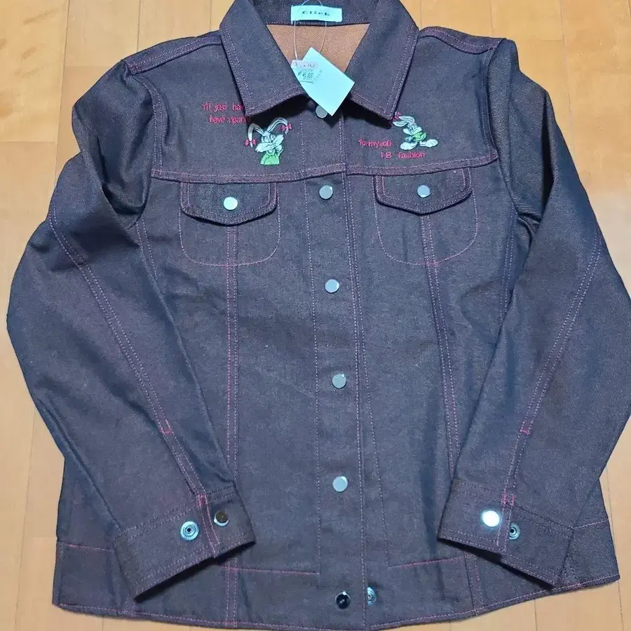 다크 브라운 데님 자켓, 캐릭터 자수 디자인이 특징입니다.
