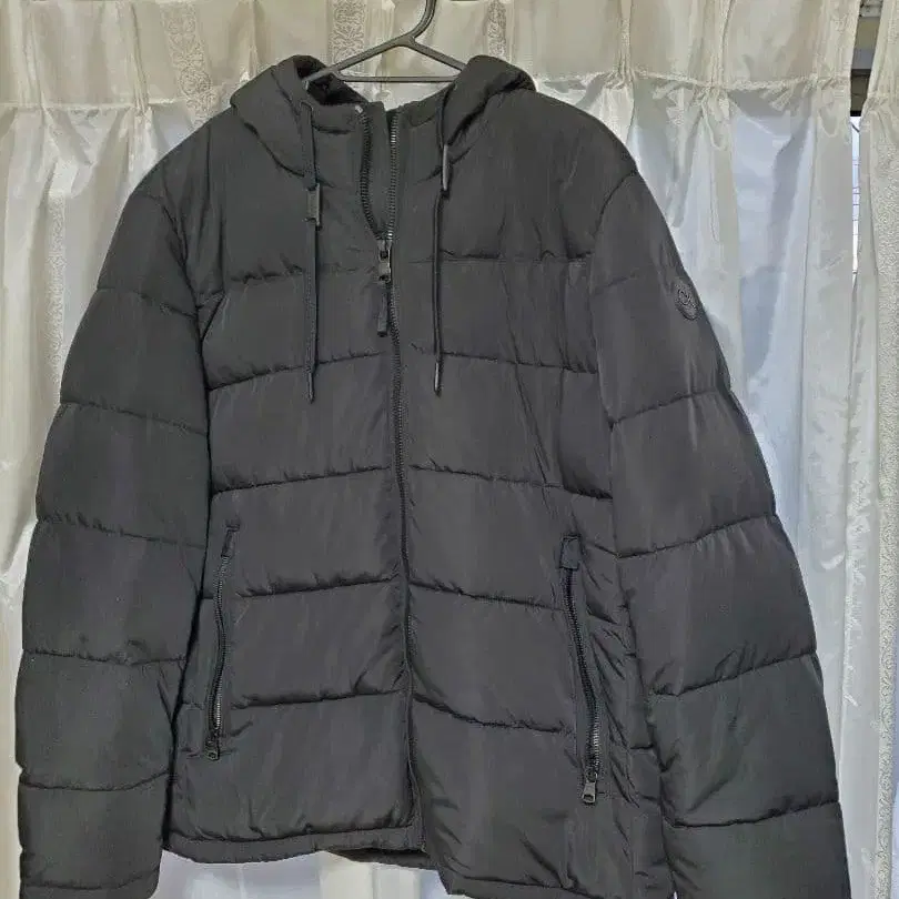후드 부착 블랙 Calvin Klein 다운 자켓.