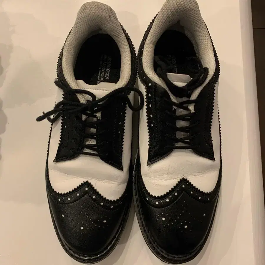 블랙/화이트 클래식 타입 골프화 스파이크리스 트랙션 스터드 부착 사이즈 - 25.5cm 몇 번 사용했지만, 아직 깨끗하게 사용할 수 있습니다.