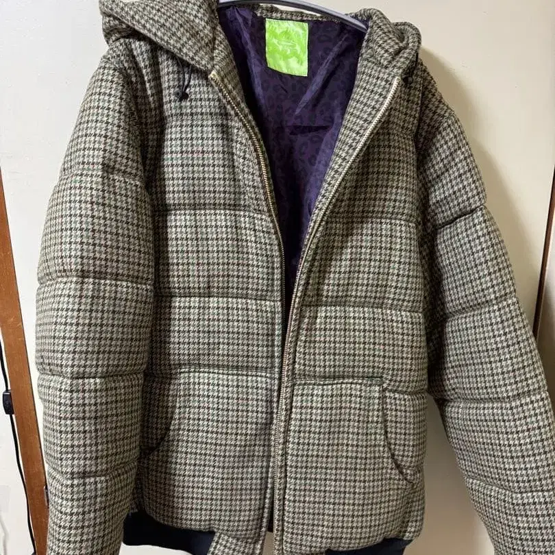 스와거 다운 자켓입니다. 사이즈는 L이지만 빅 사이즈로 오버 사이즈로 착용 가능합니다. 안감이 보라색 레오파드 무늬입니다.