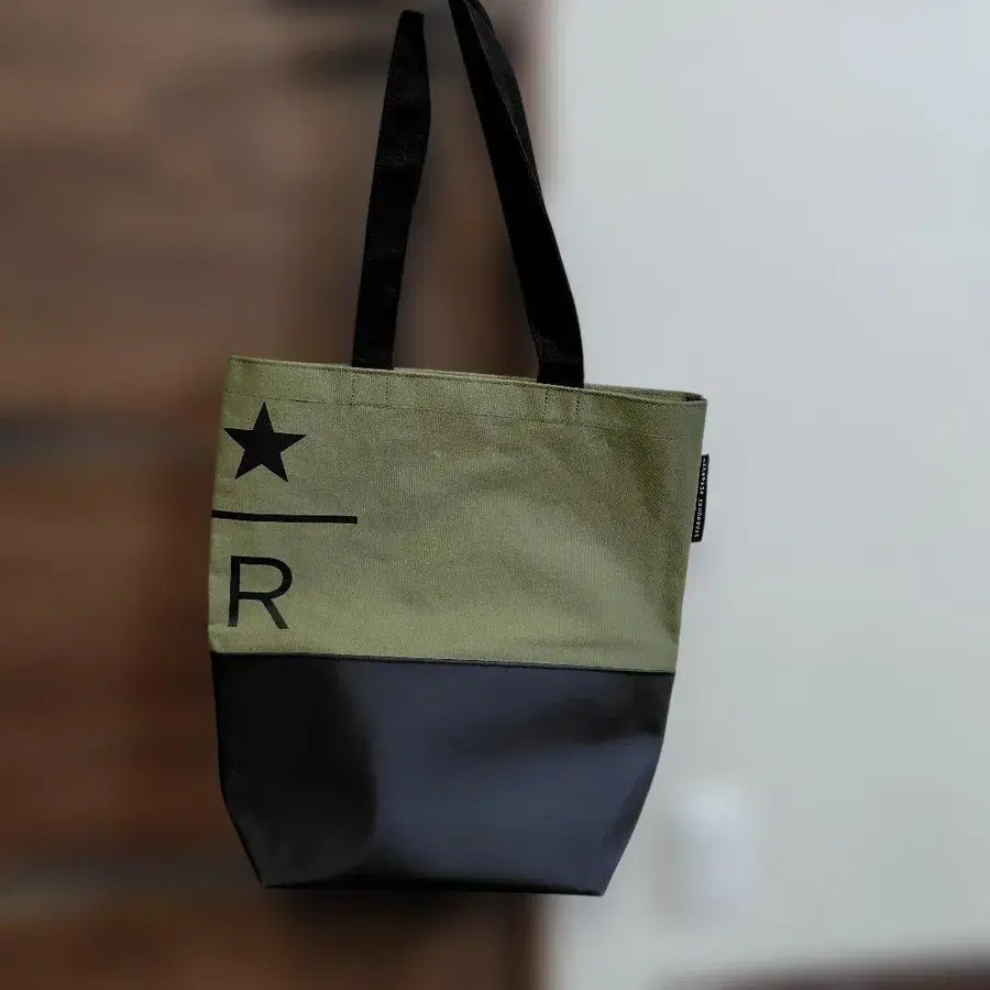 올리브 그린과 블랙 색상에 스타가 그려진 토트백. - 브랜드: Starbucks Reserve - 색상: 올리브 그린/블랙 - 소재: 캔버스/합성 피혁 - 디자인: 스타와 R 프린트 - 스타일: 토트백 방문해 주셔서 감사합니다.