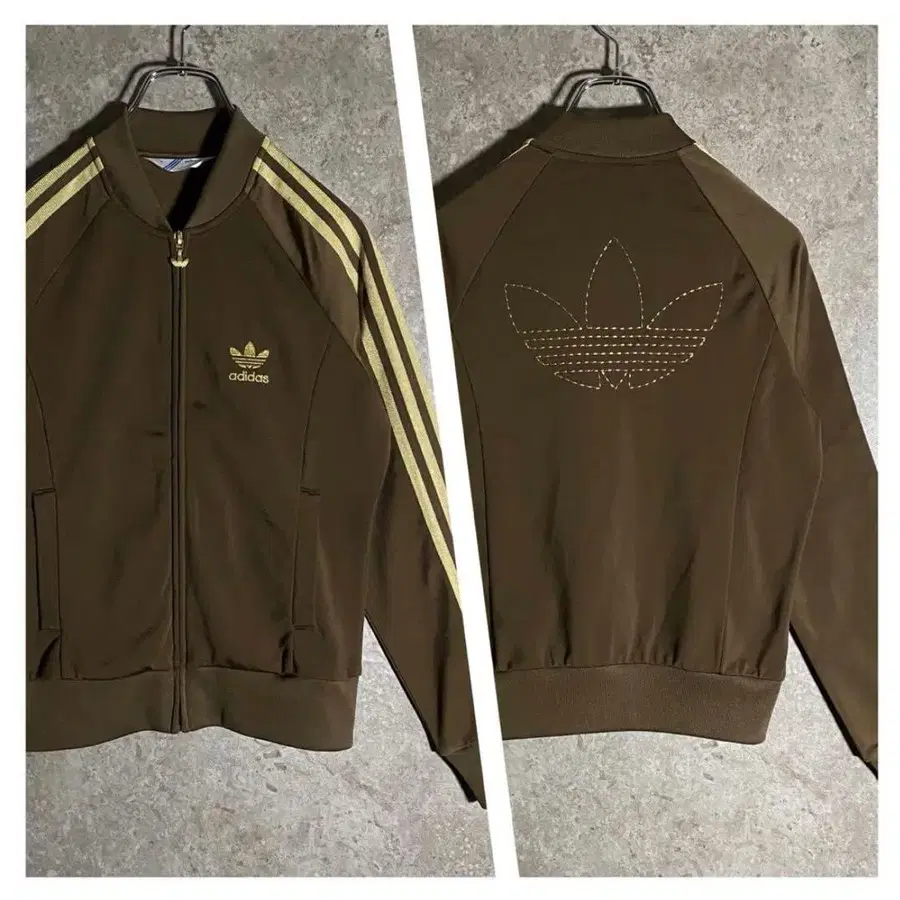 adidas 저지입니다 ☆ 브라운 컬러에 샴페인 골드 자수와 라인이 매우 고급스럽고 귀여우며, 심플해서 사용하기 쉽고 돌려입기 좋은 한 벌입니다 ♪