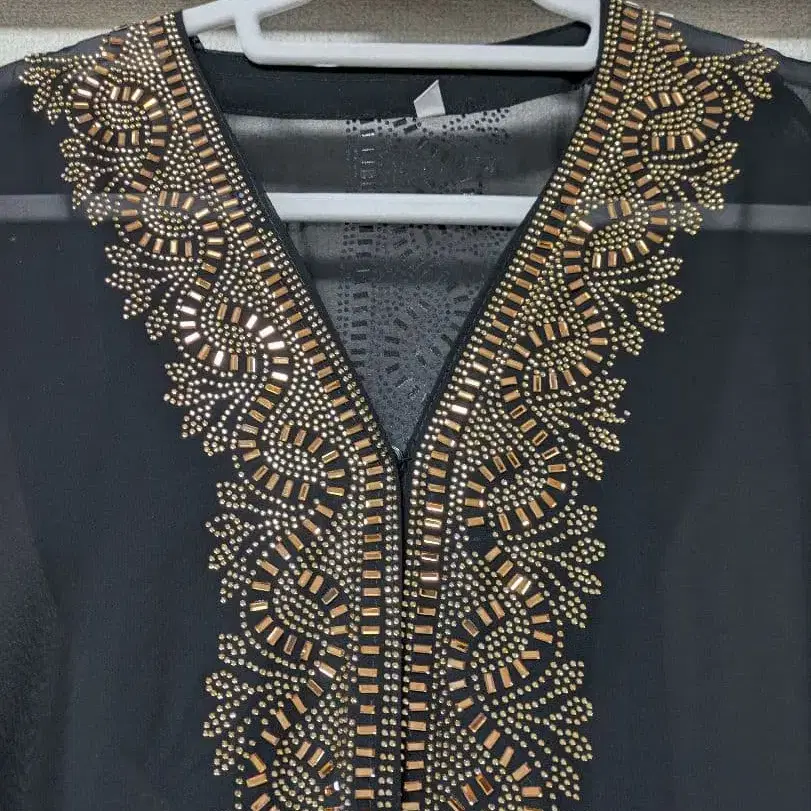 비즈 자수가 놓인 엘레강트한 블랙 후드 부착 롱 커버.