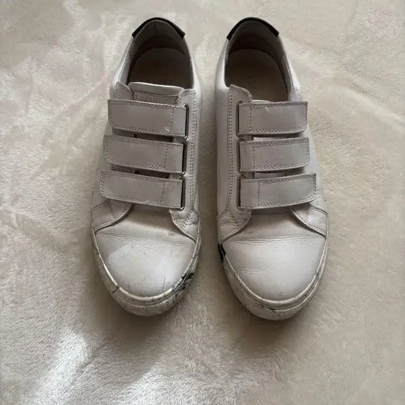 벨크로 스트랩의 화이트 가죽 신발입니다.