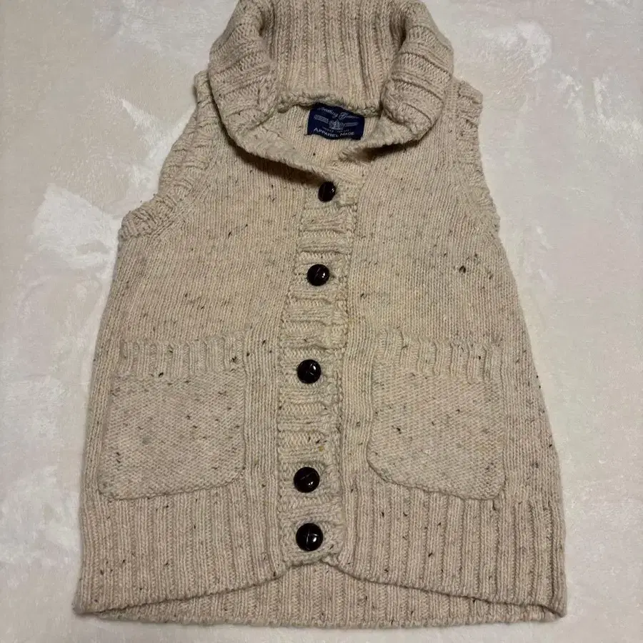 크림색 니트 베스트, 버튼과 포켓이 있습니다.