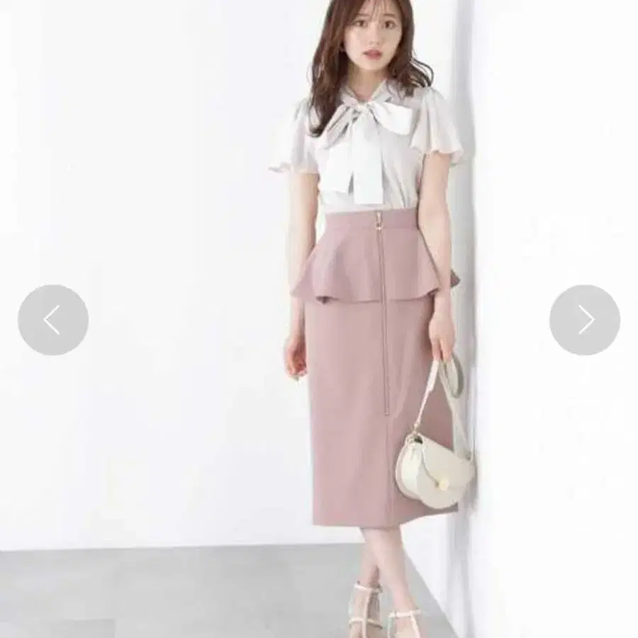 페플럼 디자인의 핑크 스커트, 프릴 소매가 달려 엘레강트한 인상을 줍니다.