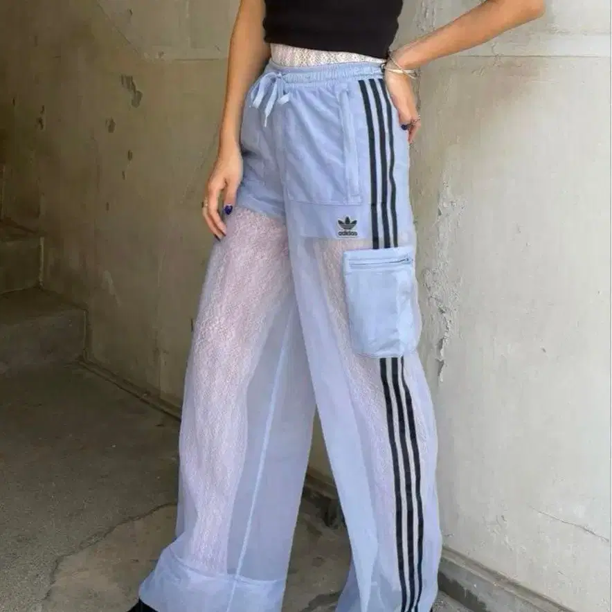 자동 번역되었어요. 원문보기메쉬 소재의 라이트 블루 와이드 팬츠, adidasoriginals의 스트라이프 디자인.