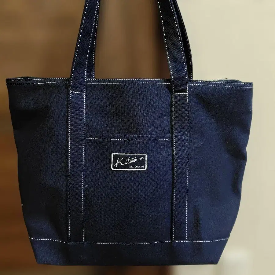 네이비 색상의 토트백, 내부 포켓이 있어 실용적입니다.
