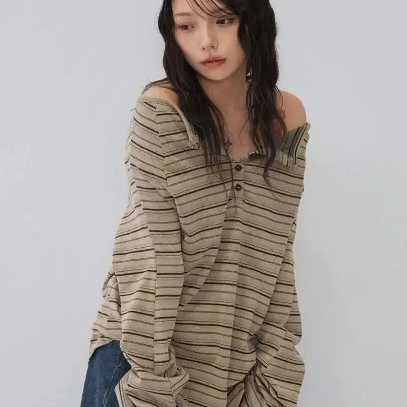 Enewd nina 스트라이프 버튼 오프숄더 티 색상: 베이지 미개봉 새상품 구매 후 개봉하지 않고 집에서 보관했습니다. 오프숄더 스트라이프 긴팔 티셔츠 사이즈 - FREE SIZE