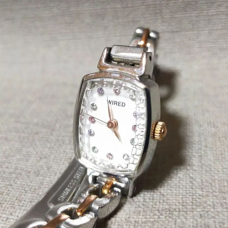 와이어드 실버와 로즈 골드 스퀘어 손목시계, 스톤 장식 포함. - 브랜드: WIRED - 색상: 실버/로즈 골드 - 디자인: 스퀘어형 - 스트랩 소재: 스테인리스 스틸 - 다이얼 장식: 스톤 포함 방문해 주셔서 감사합니다.