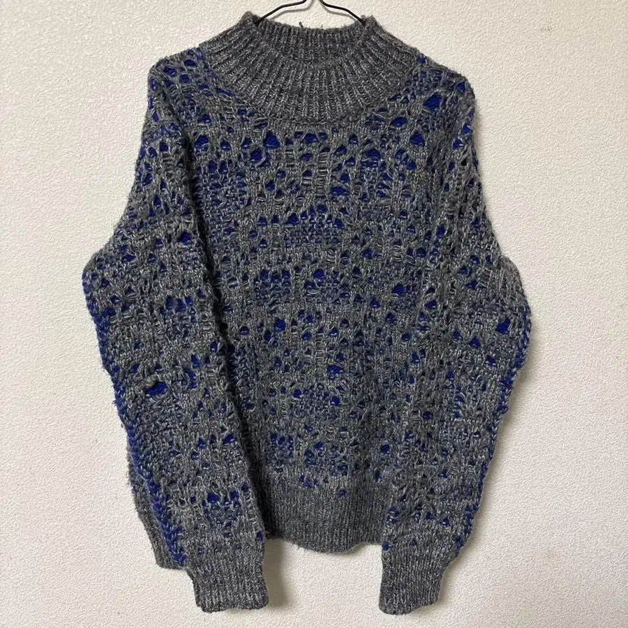 그레이와 파랑 레이스 니트 스웨터, 하이넥 디자인. - 색상: 그레이와 파랑 혼합 - 디자인: 레이스 편직 스타일 - 목둘레: 하이넥 - 소매: 긴팔 - 소재: 니트 방문해 주셔서 감사합니다.