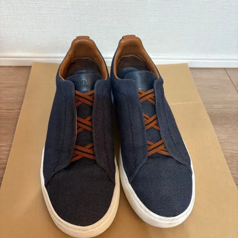 제냐(ZEGNA)의 신발입니다. - 색상: 네이비 - 소재: 캔버스, 가죽 - 디자인: 슬립온 스타일 - 밑창: 러버 솔 - 신발끈: 오렌지 컬러 신발끈 방문해 주셔서 감사합니다. 사이즈 - 7EU 8US S5265Z