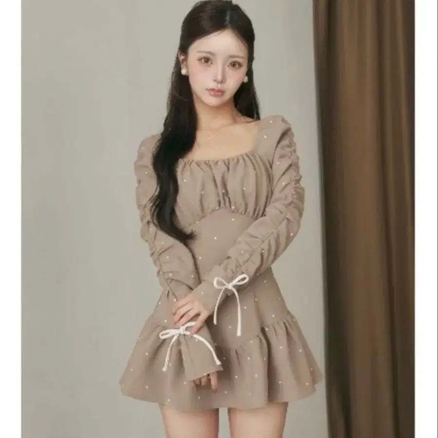 [ 택 포함 새상품 ] 아멜쥬 리본 숄더 미니 원피스 베이지