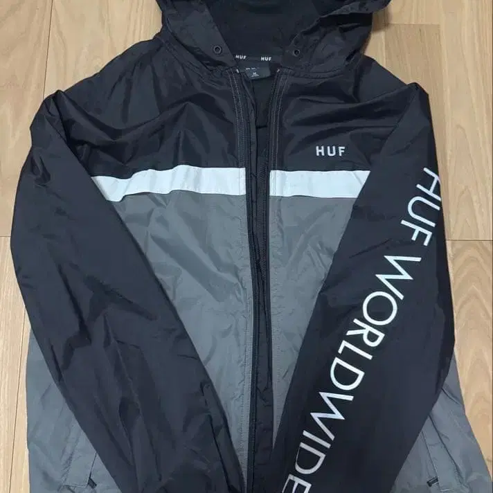 후드 부착 블랙 그레이 나일론 자켓, HUF 로고 프린트 포함. - 브랜드: HUF - 색상: 블랙 그레이 - 사이즈: M - 디자인: 후드 부착, 로고 프린트 방문해 주셔서 감사합니다. HUF 나일론 자켓