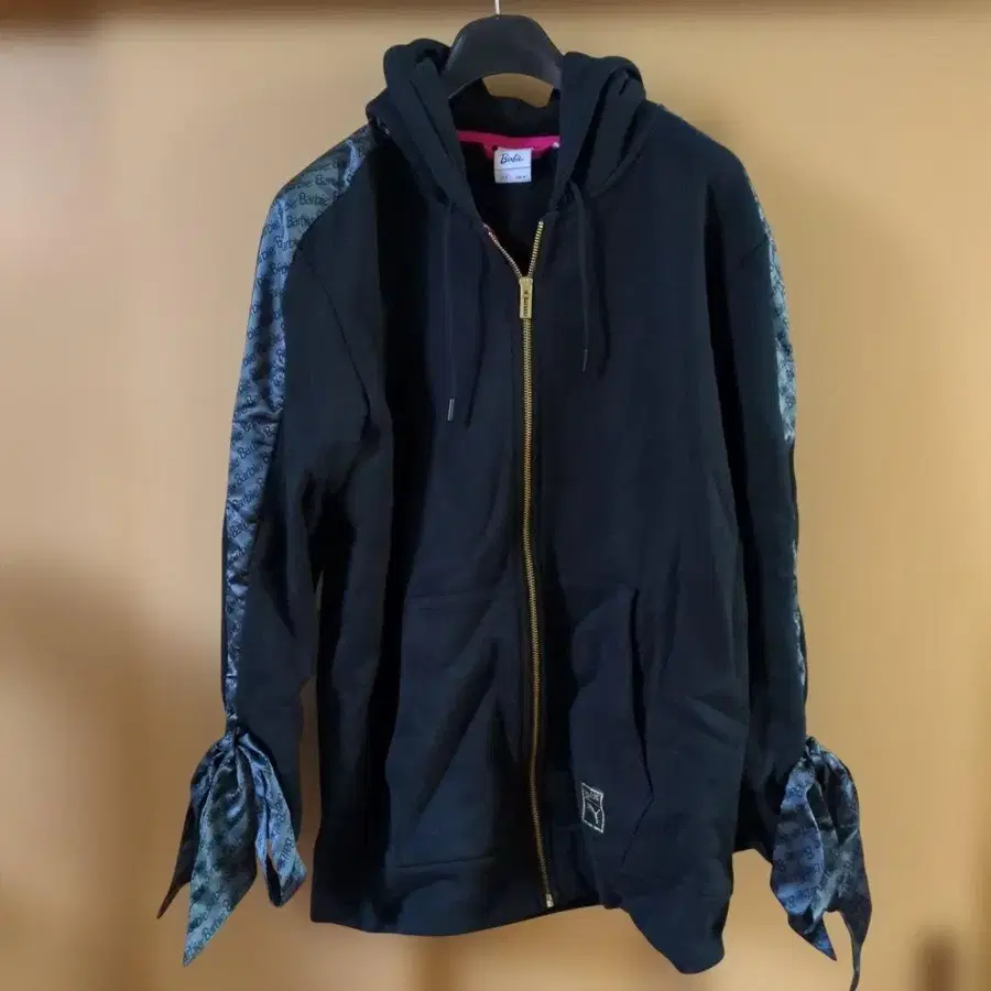 블랙 후드티, 리본 포함 슬리브 디자인으로 Barbie 스타일을 돋보이게 합니다.