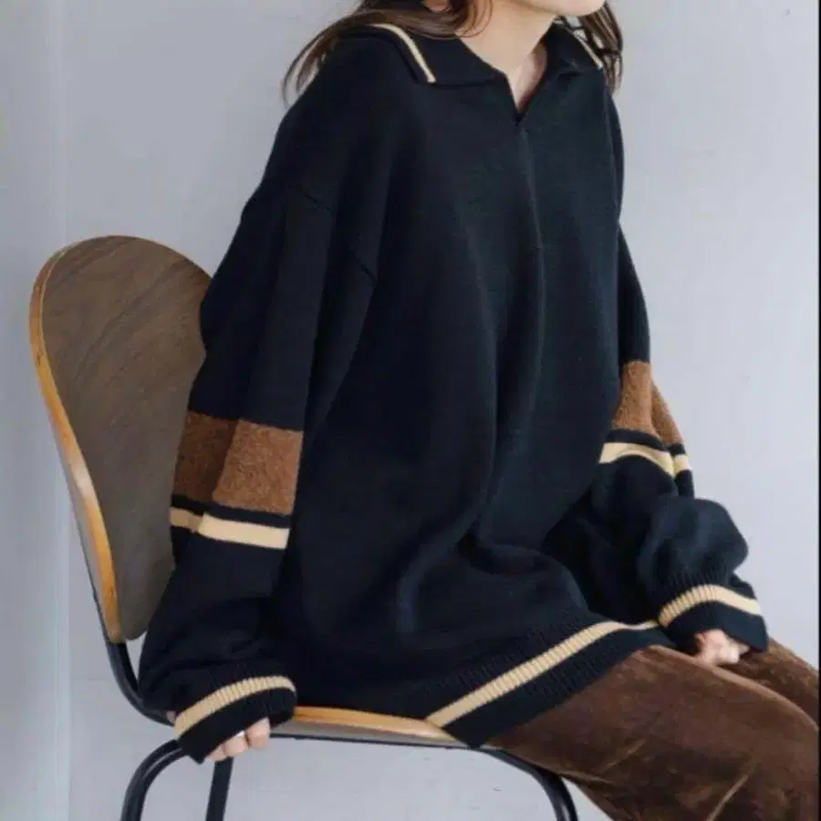 폴로 셔츠 스타일의 긴팔 니트, 블랙 색상에 베이지와 브라운 스트라이프가 악센트.