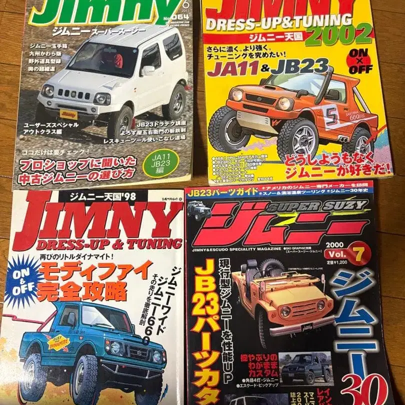 스즈키 짐니의 드레스업과 튜닝에 관한 상세한 정보가 가득한 잡지 세트. - 타이틀: SUPER SUZY Jimny 2002 - 타이틀: 짐니 30년 카탈로그 - 타이틀: 짐니 드레스업&튜닝 1998 - 타이틀: 짐니 드레스업&튜닝 2000 방문해 주셔서 감사합니다.