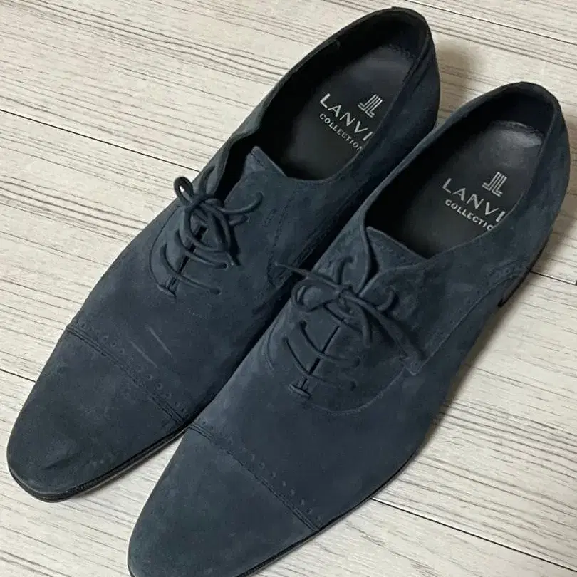 다크 그레이 스웨이드 소재로, 엘레강트한 레이스업 디자인의 드레스 슈즈. - 브랜드: LANVI COLLECTION - 색상: 다크 그레이 - 소재: 스웨이드 - 스타일: 드레스 슈즈 - 디자인: 레이스업 방문해 주셔서 감사합니다. 사이즈 - 27cm 상자 없음. 아직 2회 정도밖에 사용하지 않아 상태가 매우 좋습니다. ※ 다른 신발 박스로 대신하겠습니다.
