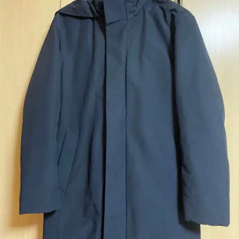 자동 번역되었어요. 원문보기후드 부착, 심플한 네이비 색상의 다운 자켓, 사이드 포켓 포함.