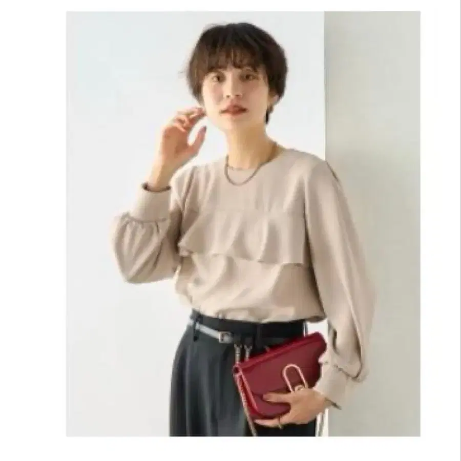 연한 베이지색 프릴이 달린 긴팔 블라우스