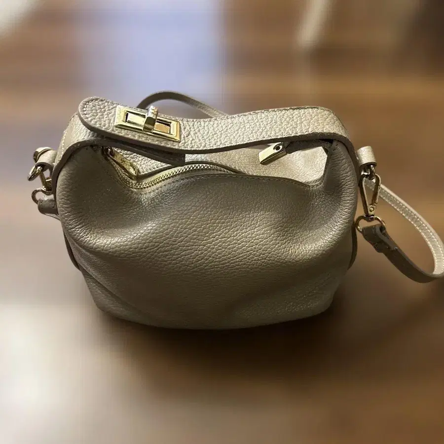 베이지 색상의 가죽 숄더백, 조정 가능한 스트랩으로 사용하기 편리한 디자인.