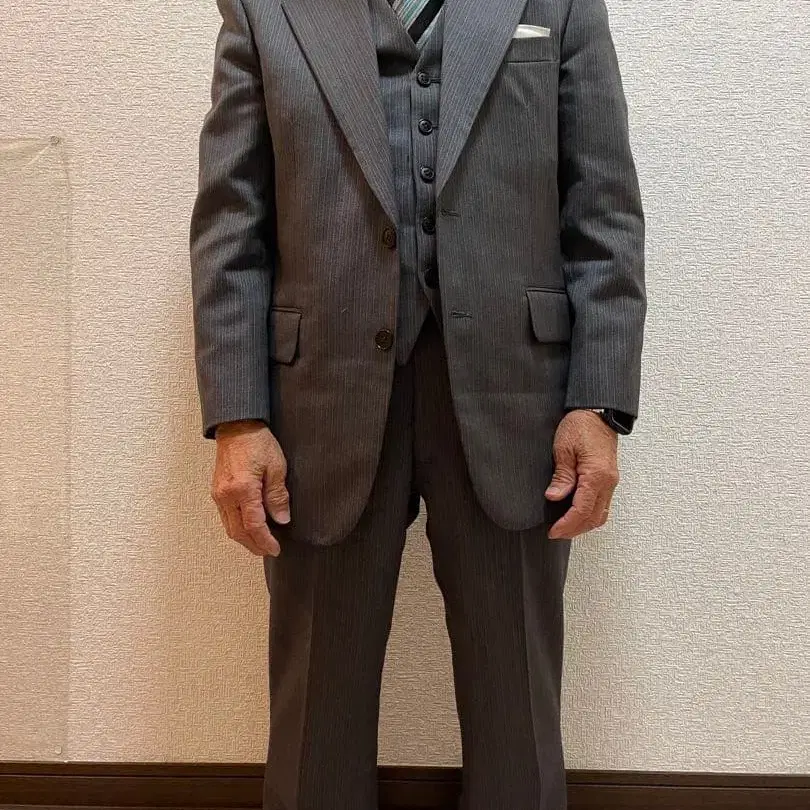 스트라이프 디자인의 그레이 비즈니스 정장, 울 100%, 베스트 포함. - 색상: 그레이 - 스타일: 비즈니스 정장 - 소재: 울 100% - 디자인: 스트라이프 - 부속품: 베스트 - 자켓 개폐: 버튼식 - 안감: 실버 4A 사이즈, 허리 약 80cm 와이셔츠, 넥타이, 치프는 포함되지 않습니다. 방문해 주셔서 감사합니다.
