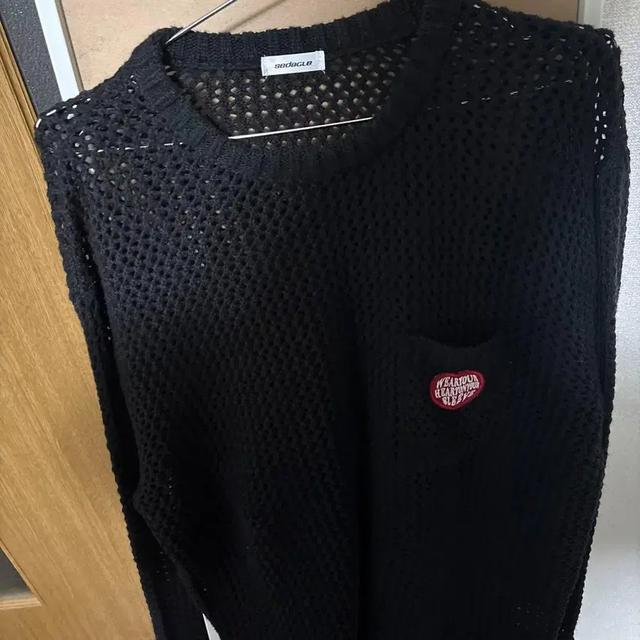 sedagle 메쉬 편직 블랙 스웨터 하트 포켓 부착