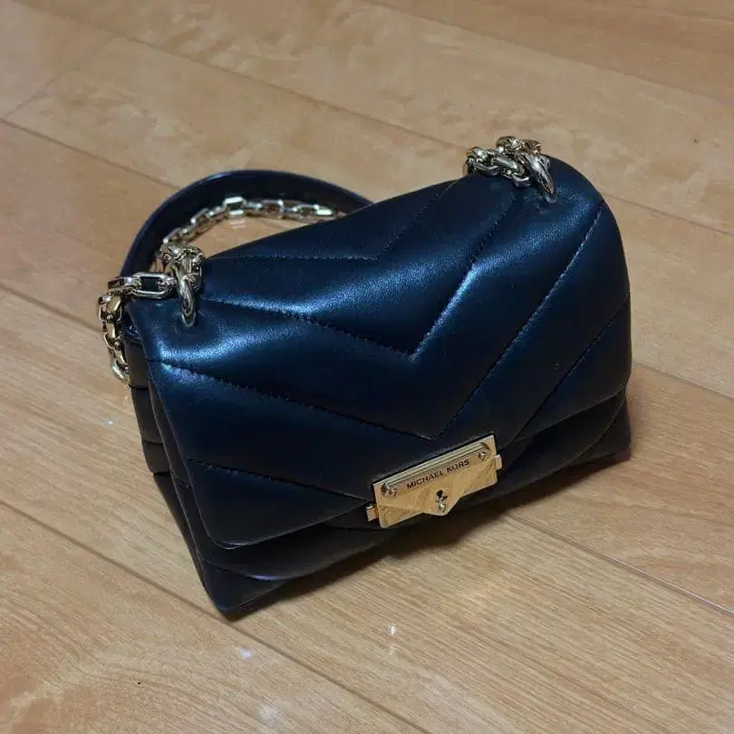 퀼팅 디자인의 네이비와 블랙 숄더백, 골드 금장 장식이 특징입니다.