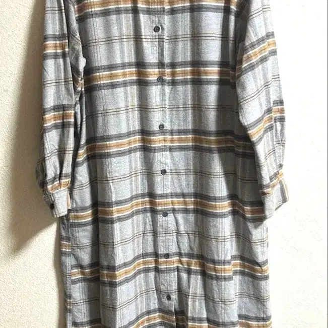 면 100%, 그레이 계열의 큰 체크 무늬 롱 셔츠 원피스, M 사이즈, 긴팔 디자인. 양쪽 사이드에 포켓이 있어 겉옷으로도 유용했습니다.