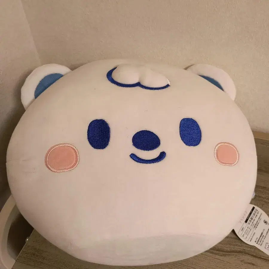 귀여운 화이트 컬러의 우에땅 쿠션, 파란 귀와 미소가 특징입니다. - 디자인: 화이트 컬러의 둥근 쿠션, 파란 귀와 얼굴 특징 - 상품명: 우에땅 쿠션 - 브랜드명: 코로롱과 친구들 방문해 주셔서 감사합니다.
