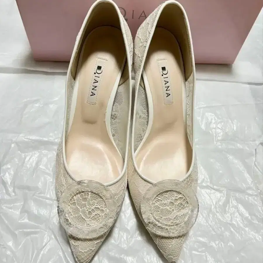 방문해 주셔서 감사합니다. 아이보리 색상의 레이스 튤, 클리어 버클이 달린 펌프스입니다. 새상품으로 구매하여 결혼식 때 사용했습니다. DIANA 상자에 넣어 보내드립니다. - 색상: 화이트 (아이보리) - 소재: 레이스 튤 - 스타일: 펌프스 - 사이즈: 24cm - 힐 높이: 8cm - 스틸레토 질문사항이 있으시면 언제든지 편하게 연락 주세요. 잘 부탁드립니다.