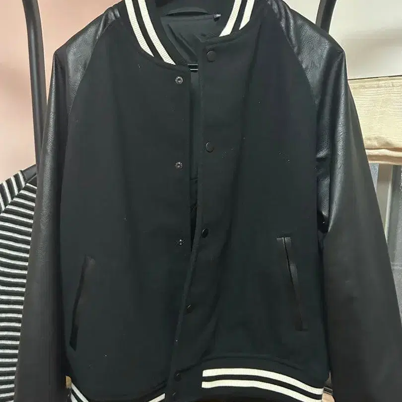 울과 합성 피혁의 바시티 자켓, 스트라이프 리브 포함. - 색상: 블랙 - 소재: 울과 합성 피혁 - 디자인: 바시티 자켓 스타일 - 디테일: 스트라이프 리브 옷깃과 밑단 - 포켓: 사이드 포켓 있음 방문해 주셔서 감사합니다. 사이즈 - XL(LL)