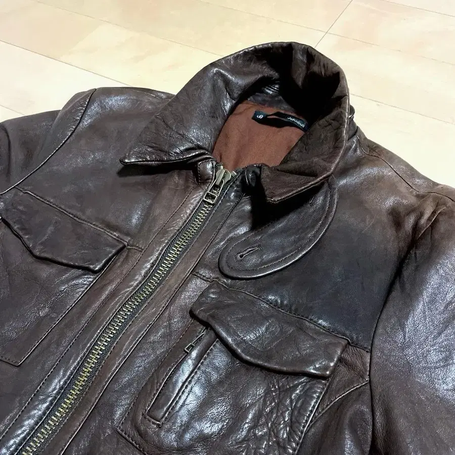 새상품급! Johnbull 램 가죽 자켓입니다! USED 가공을 하여 밀리터리풍 디자인이 멋집니다! 표기 사이즈 L 실측 사이즈 가슴 너비 50cm 기장 68cm 컬러 USED 가공 브라운 소재 표기 양가죽 상태는 좋습니다! 미니멀리스트를 위해 판매합니다!