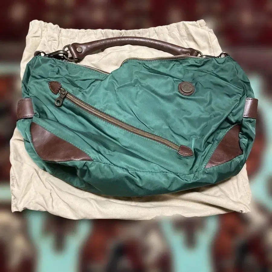 나일론과 가죽의 콤비네이션으로 만들어진, 지퍼 달린 포켓을 갖춘 실용적인 숄더백. - 색상: 그린 - 소재: 나일론과 가죽의 콤비네이션 - 특징: 지퍼 달린 포켓, 숄더 스트랩 포함 - 디자인: 심플하고 실용적인 디자인 방문해 주셔서 감사합니다.