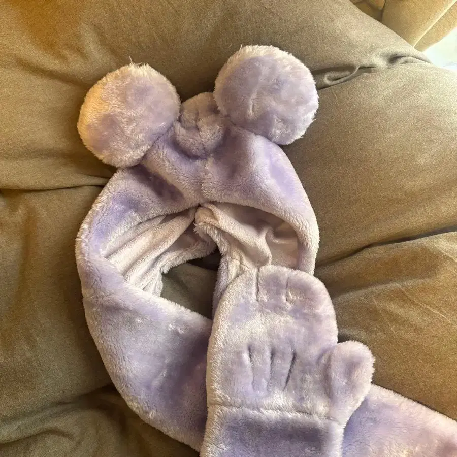 자동 번역되었어요. 원문보기연보라색의 복슬복슬한 퍼 소재로, 귀가 달린 모자와 장갑이 일체화된 귀여운 디자인입니다.