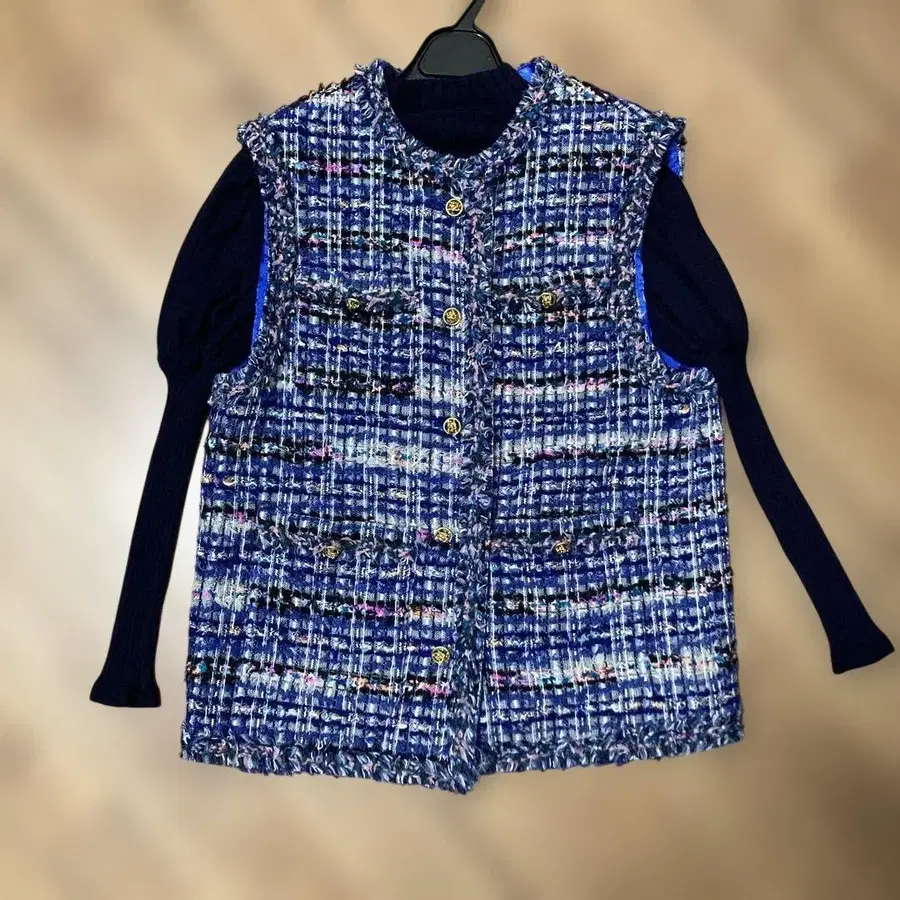 블루 계열 트위드 버튼 베스트, 프린지 엣지와 앞면 포켓 부착. 밑단에 밴딩 등이 들어가지 않고 일자로 떨어지는 형태입니다. - 색상: 블루 계열 - 소재: 트위드 - 디자인: 버튼 베스트 - 장식: 프린지 엣지 방문해 주셔서 감사합니다.