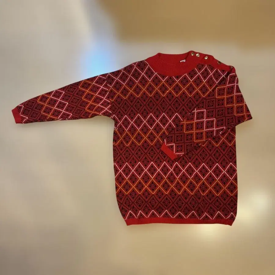 선명한 레드 색상의 다이아몬드 패턴 니트입니다. 독특한 버튼 넥라인이 특징입니다.