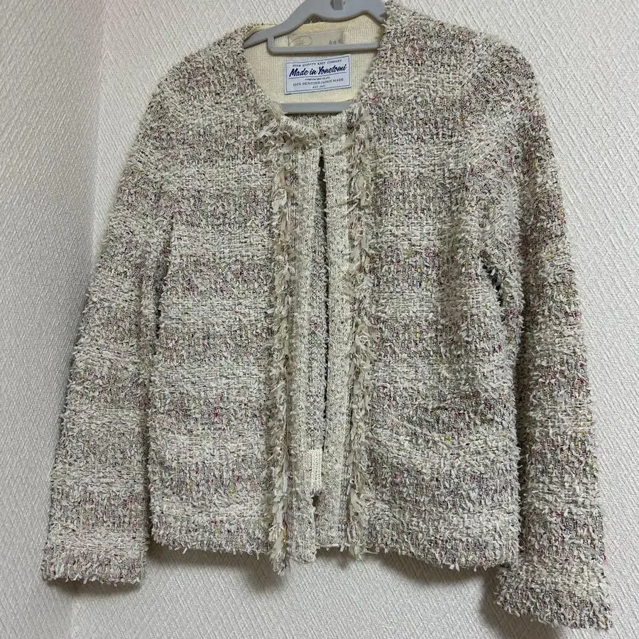다색 실을 사용한 화이트 계열의 노카라 자켓.