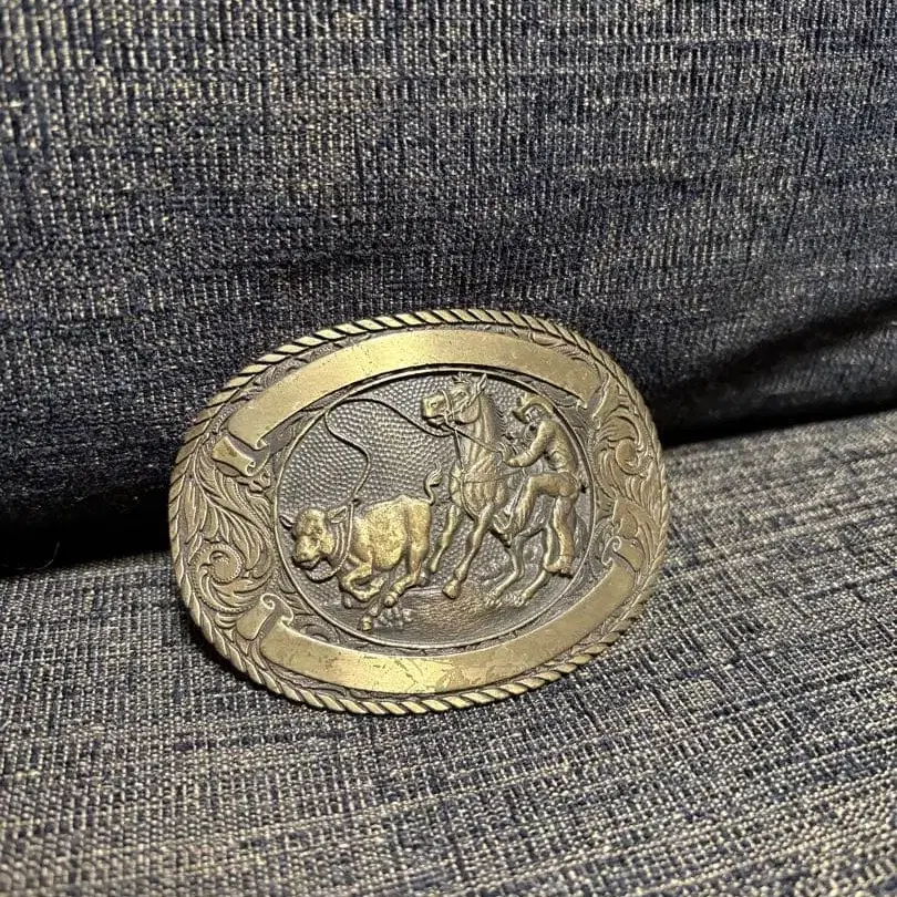 소와 기수의 조각이 특징인 금속제 벨트 버클. - 디자인: 소와 기수의 조각이 새겨진 벨트 버클 - 소재: 금속제 - 클로징: 버클식 방문해 주셔서 감사합니다.