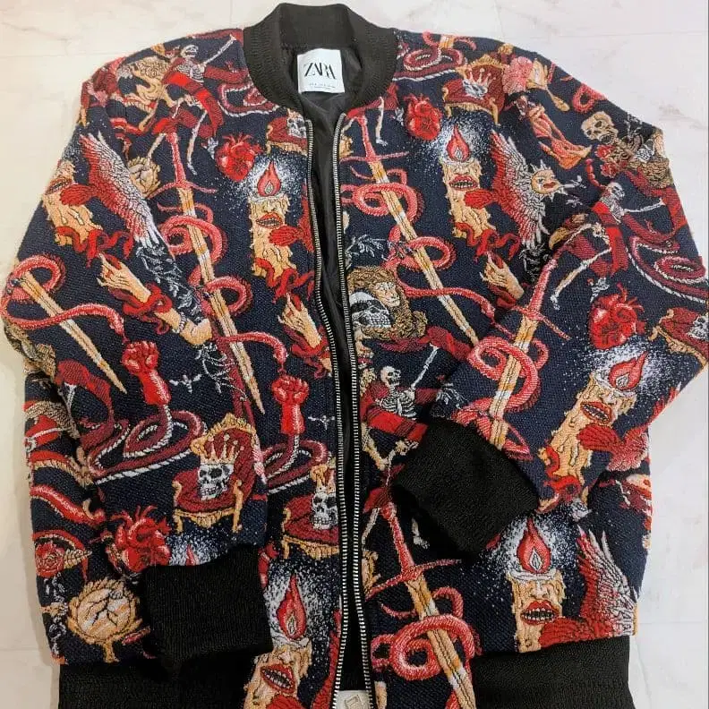새상품급 ZARA 올 패턴 자카드 자켓 블루종 스컬 자수 입체 입니다 ❁ ⃘*.゜