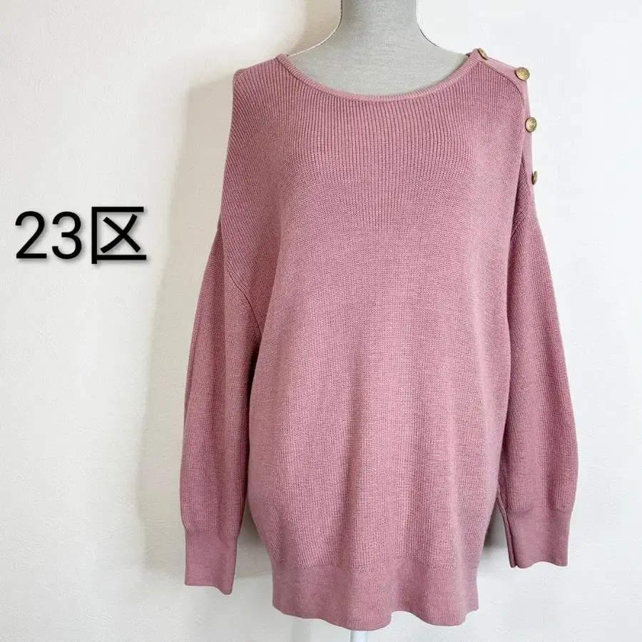 어깨 부분에는 골드 버튼이 장식되어 있으며, 보트넥 디자인이 고급스러운 악센트가 되고 있습니다.