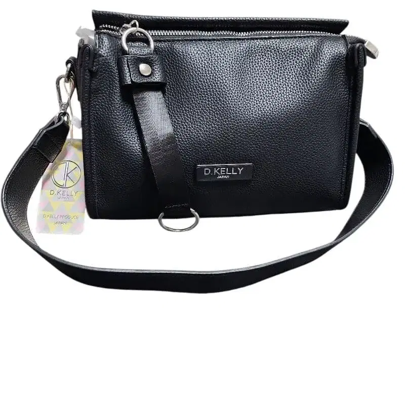 심플하고 스타일리시한 블랙 가죽 숄더백, 내부에 지퍼 포켓 있음.