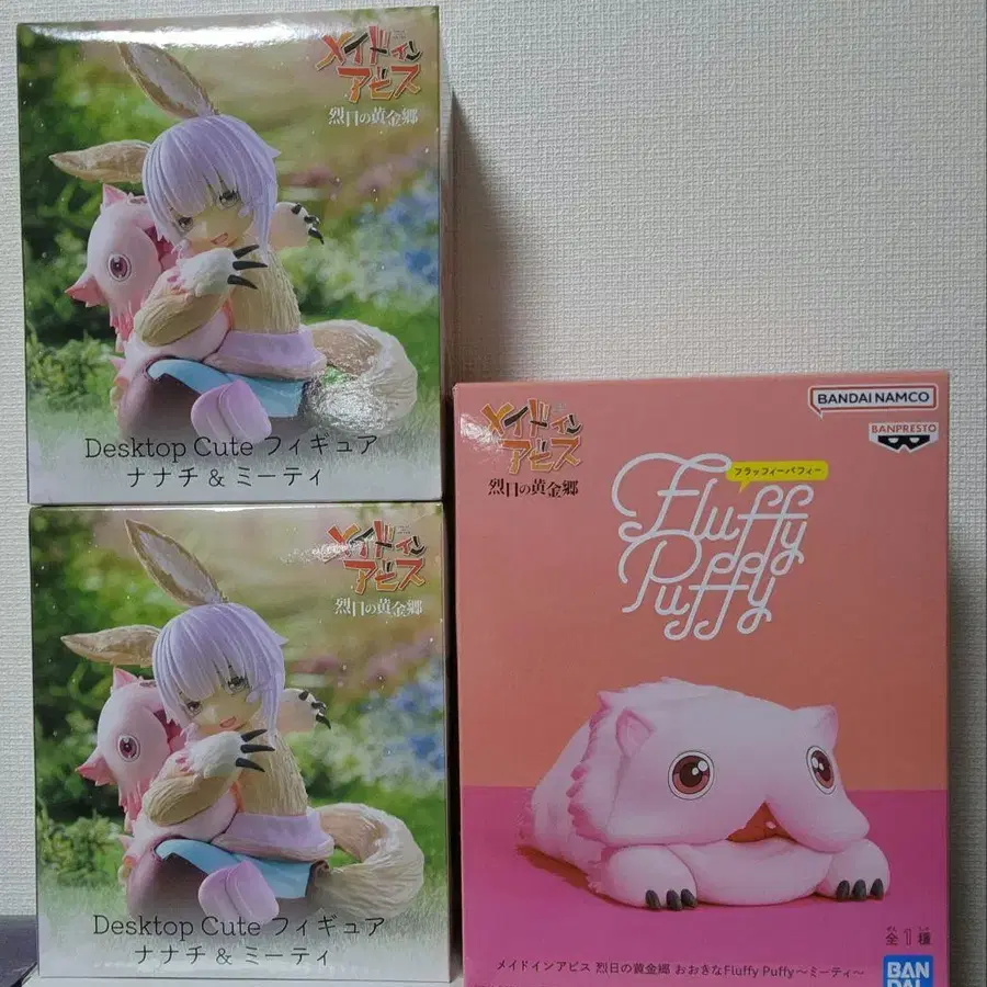 ● 메이드 인 어비스 뙤약볕의 황금향 Desktop Cute 피규어 나나치 & 미티 x 2 ● 메이드 인 어비스 뙤약볕의 황금향 큰 Fluffy Puffy 미티 x 1 종이상자에 그대로 넣어 발송합니다. 인형뽑기 경품에 이해가 있는 분의 구매를 부탁드립니다.