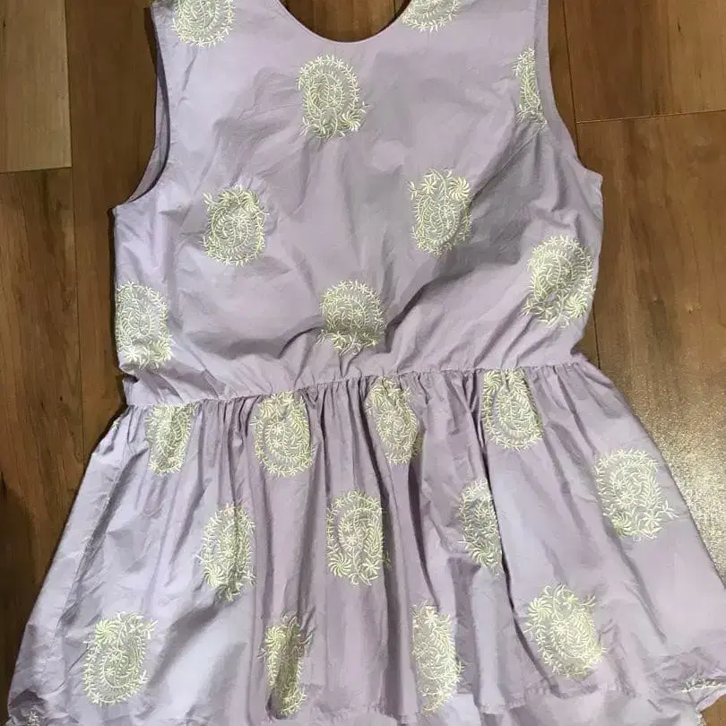 자동 번역되었어요. 원문보기누키테파의 라벤더 색상 자수 슬리브리스 플레어 상의입니다.
