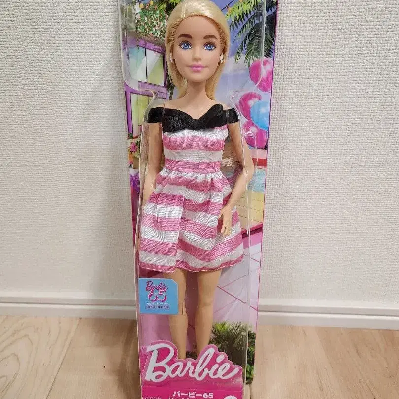 스트라이프 패턴의 드레스를 입은 바비 인형, 파란 눈과 금발 머리가 특징입니다.