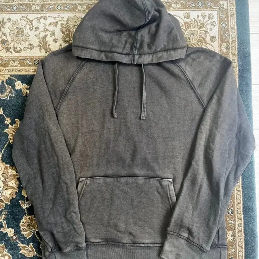 GAP의 17년산 피그먼트 가공 후드티입니다. 페이드된 듯한 느낌으로 분위기가 좋습니다. 기장 65 가슴 너비 53 소매 길이 래글런 사양 옷깃부터 소매까지 80 겨드랑이 아래부터 소매까지 54