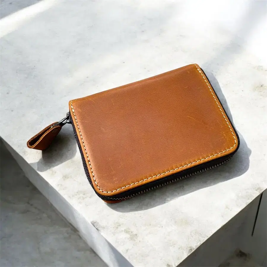 고급 천연 가죽을 사용한 라운드 지퍼 타입의 접이식 지갑입니다.